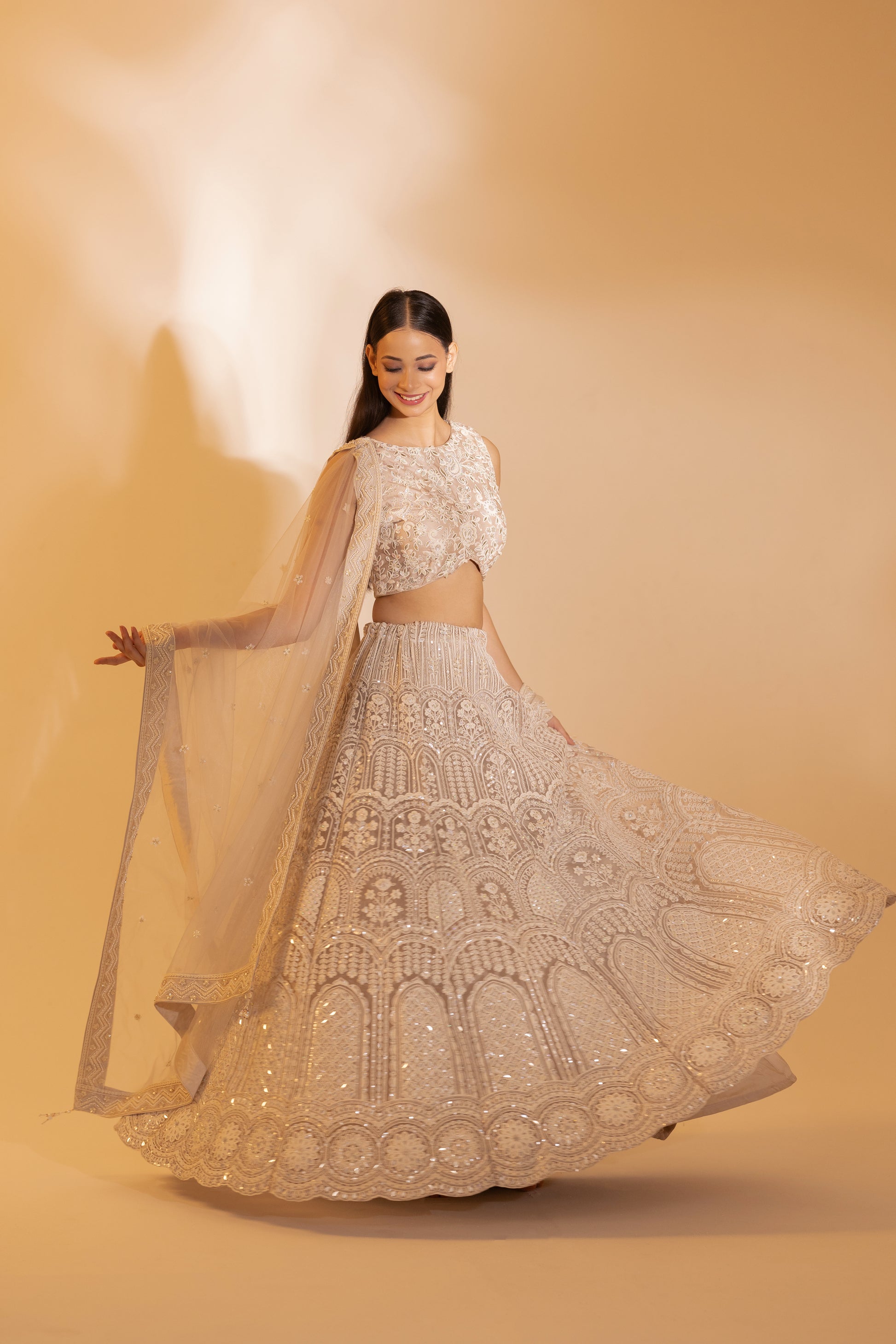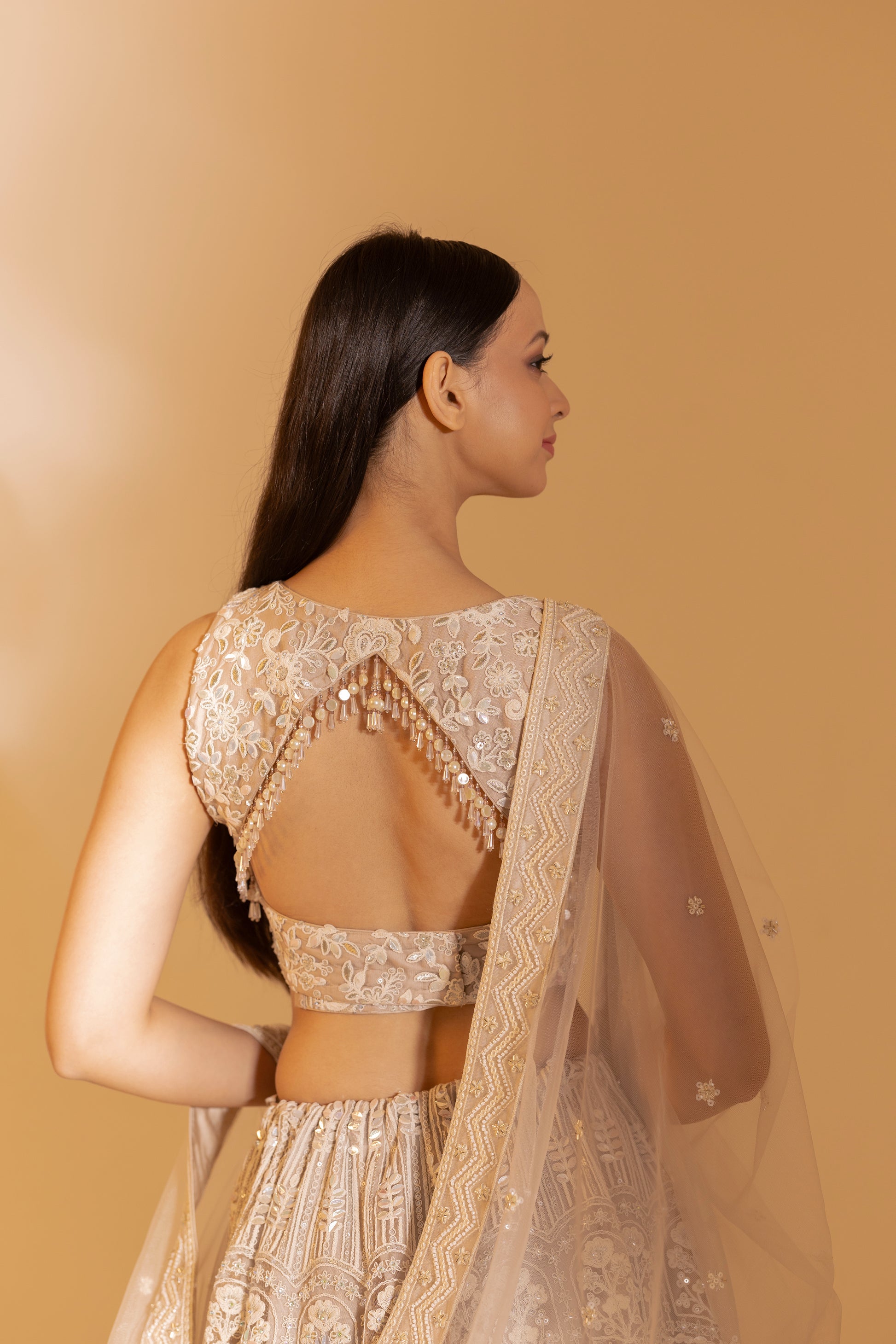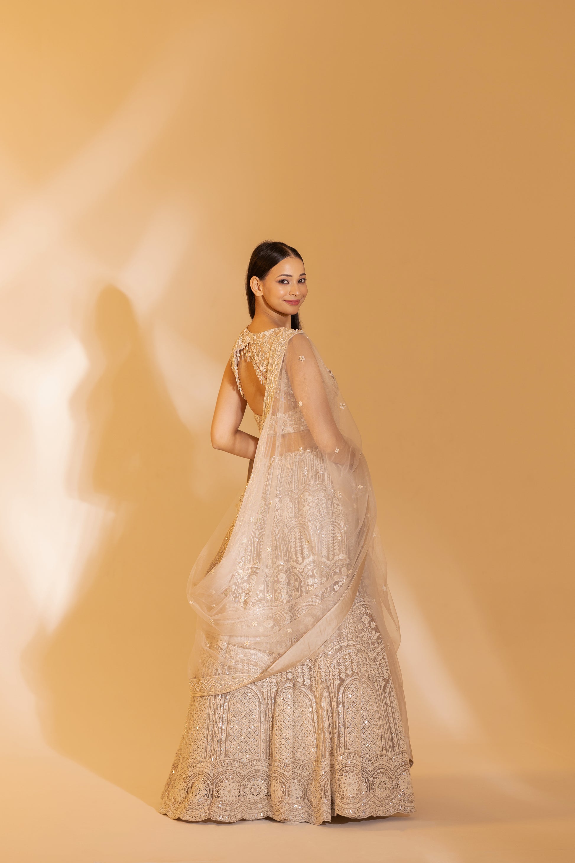 - Type: Pale Ivory/Beige Lehenga with heavy tone-on-tone Zardozi/Resham work.