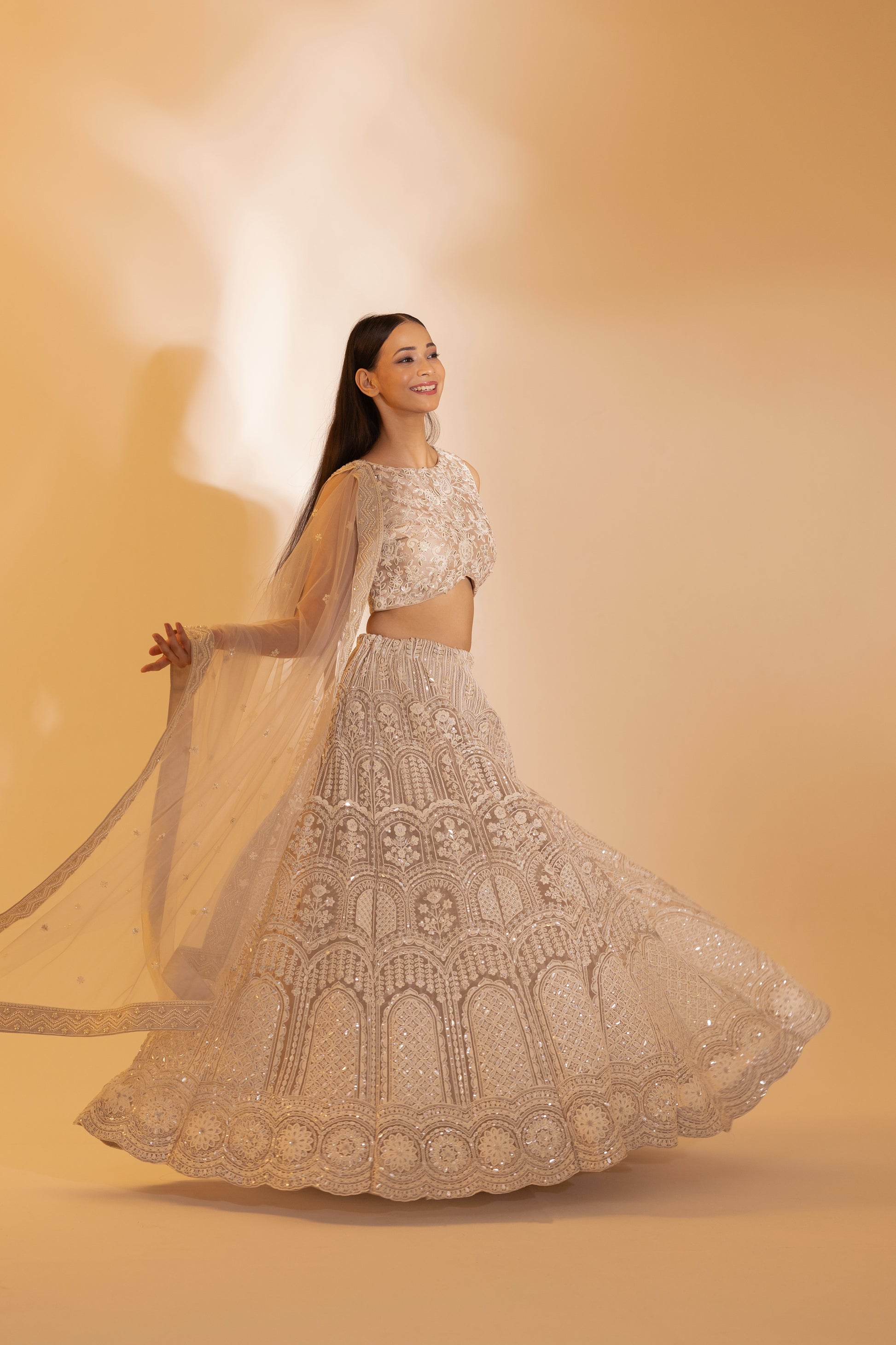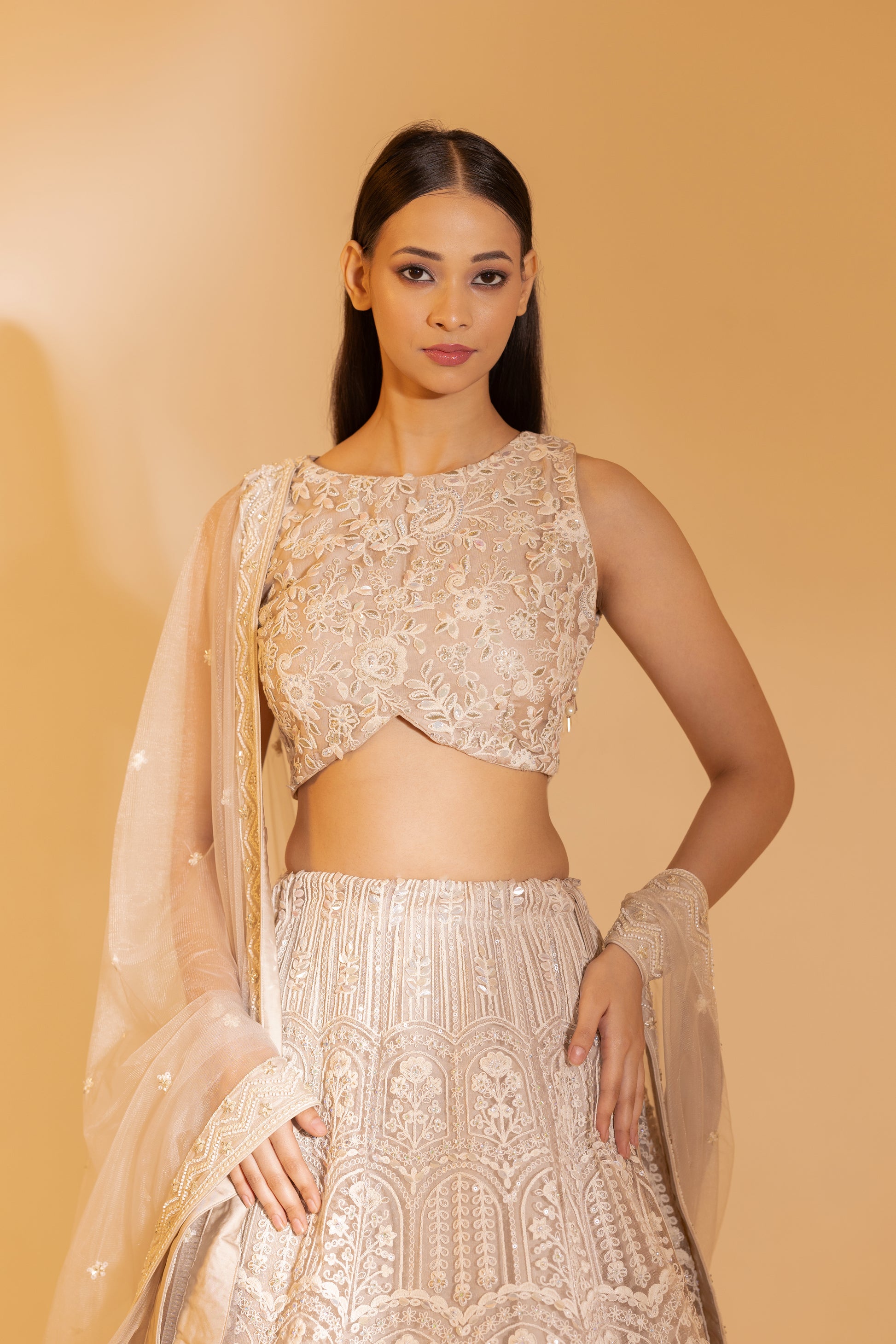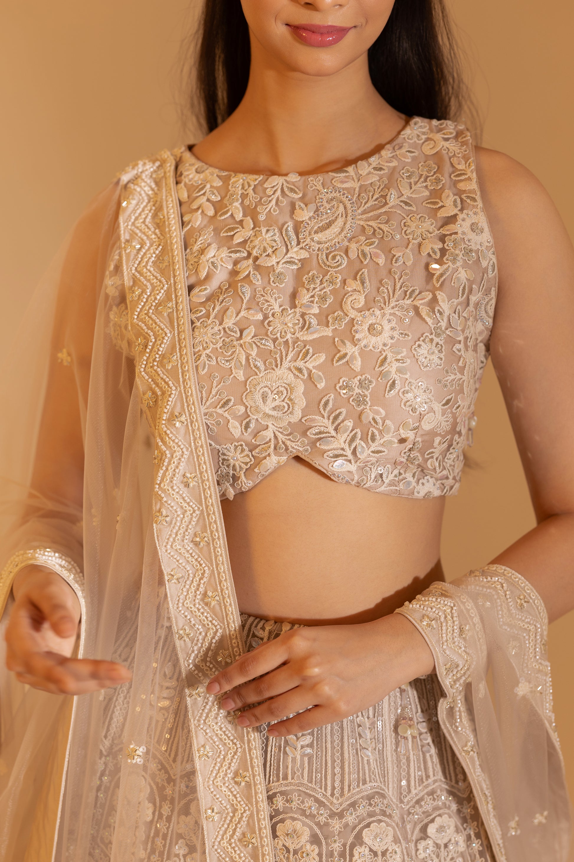 - Type: Pale Ivory/Beige Lehenga with heavy tone-on-tone Zardozi/Resham work.