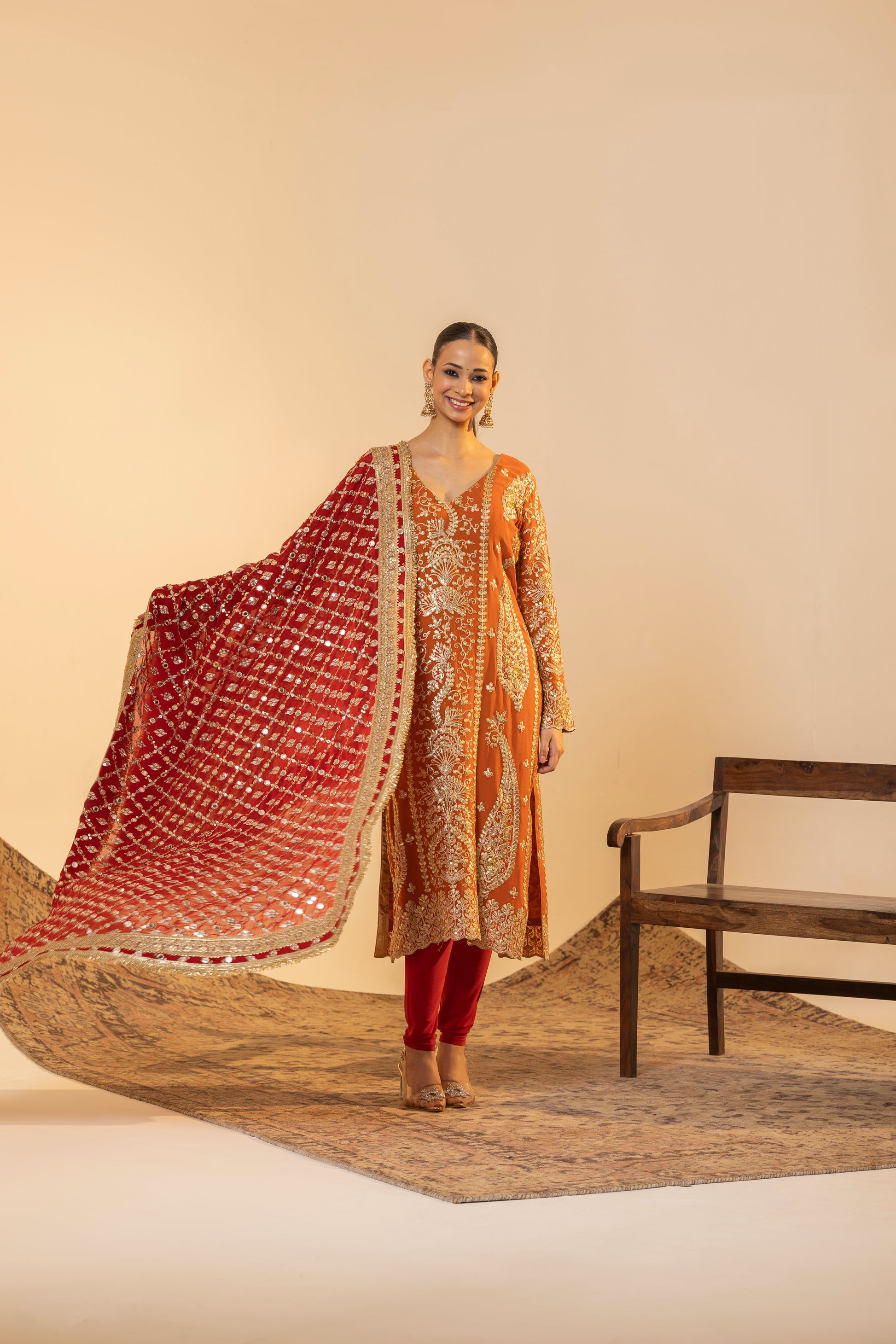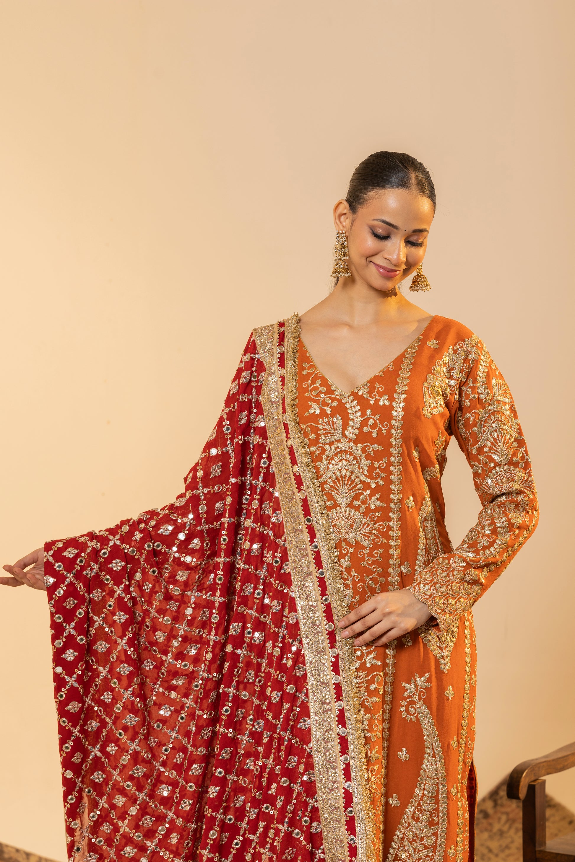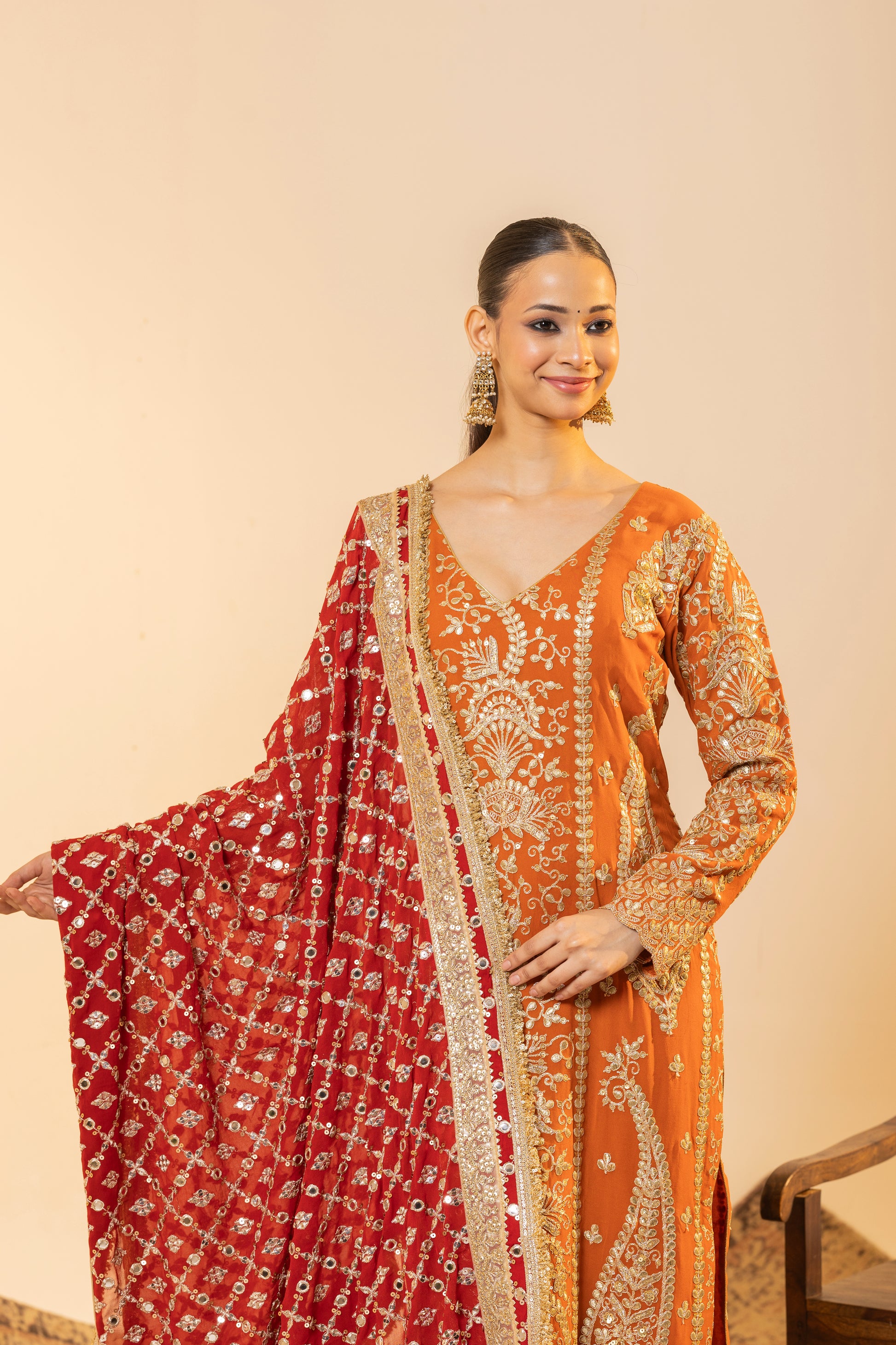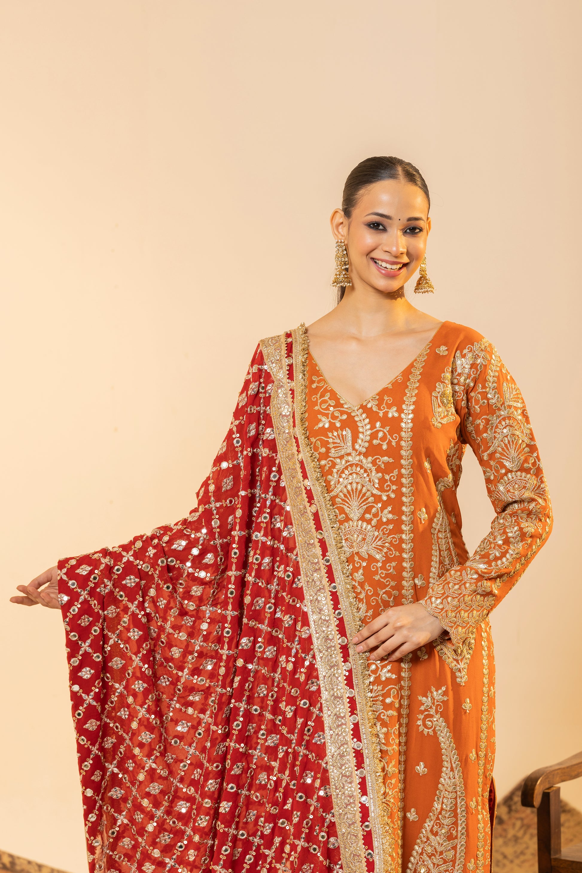 Auspicious Warmth and Rich Craftsmanship. This stunning Marigold Orange suit set captures the warmth of Indian festivities. The kurta is meticulously detailed with traditional Tilla embroidery, while the ensemble is uplifted by a heavily sequined Red Contrast Dupatta. This vibrant pairing of colours and textures makes it perfect for Karva Chauth, Diwali, or any grand Festive occasion.