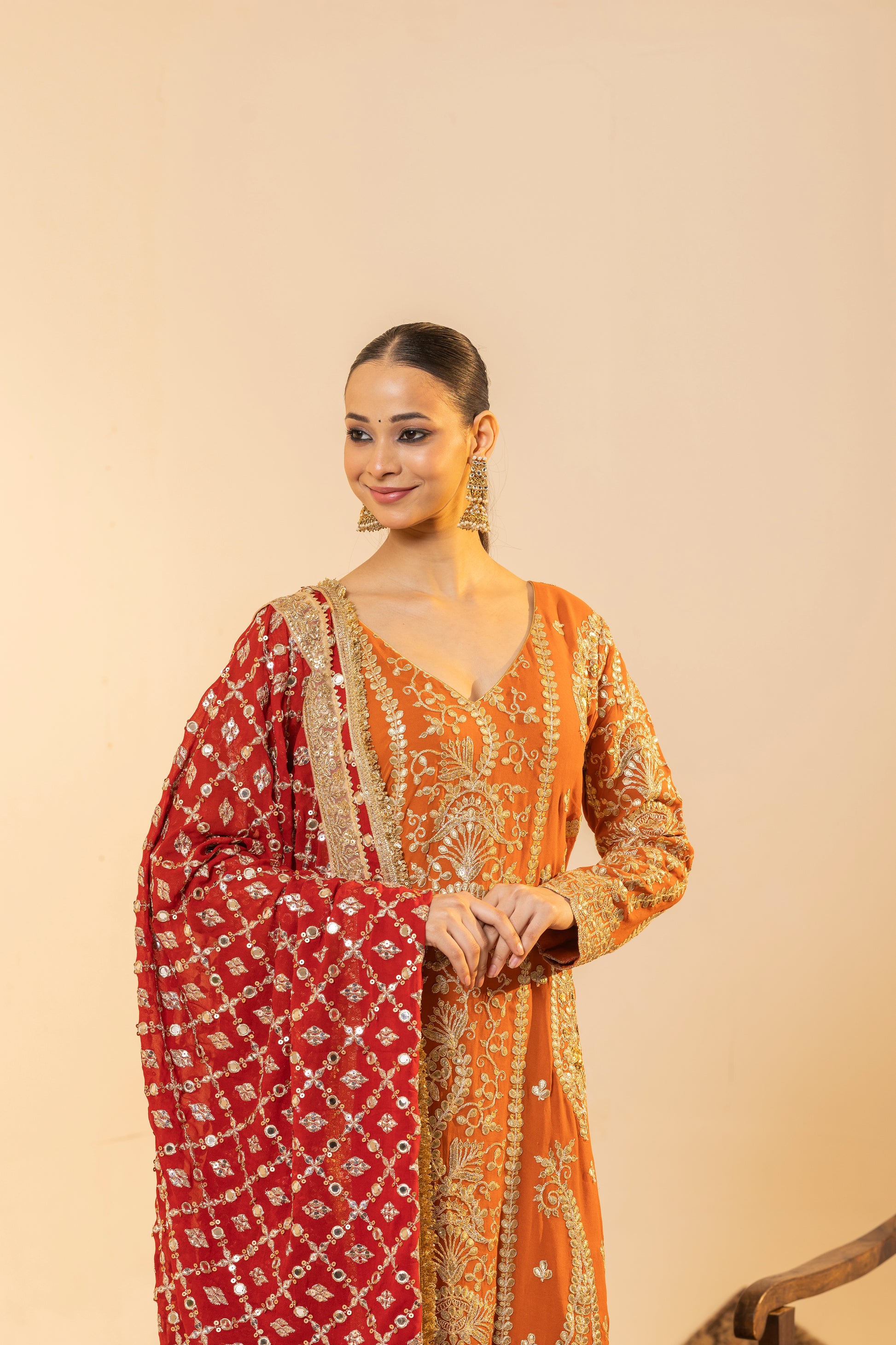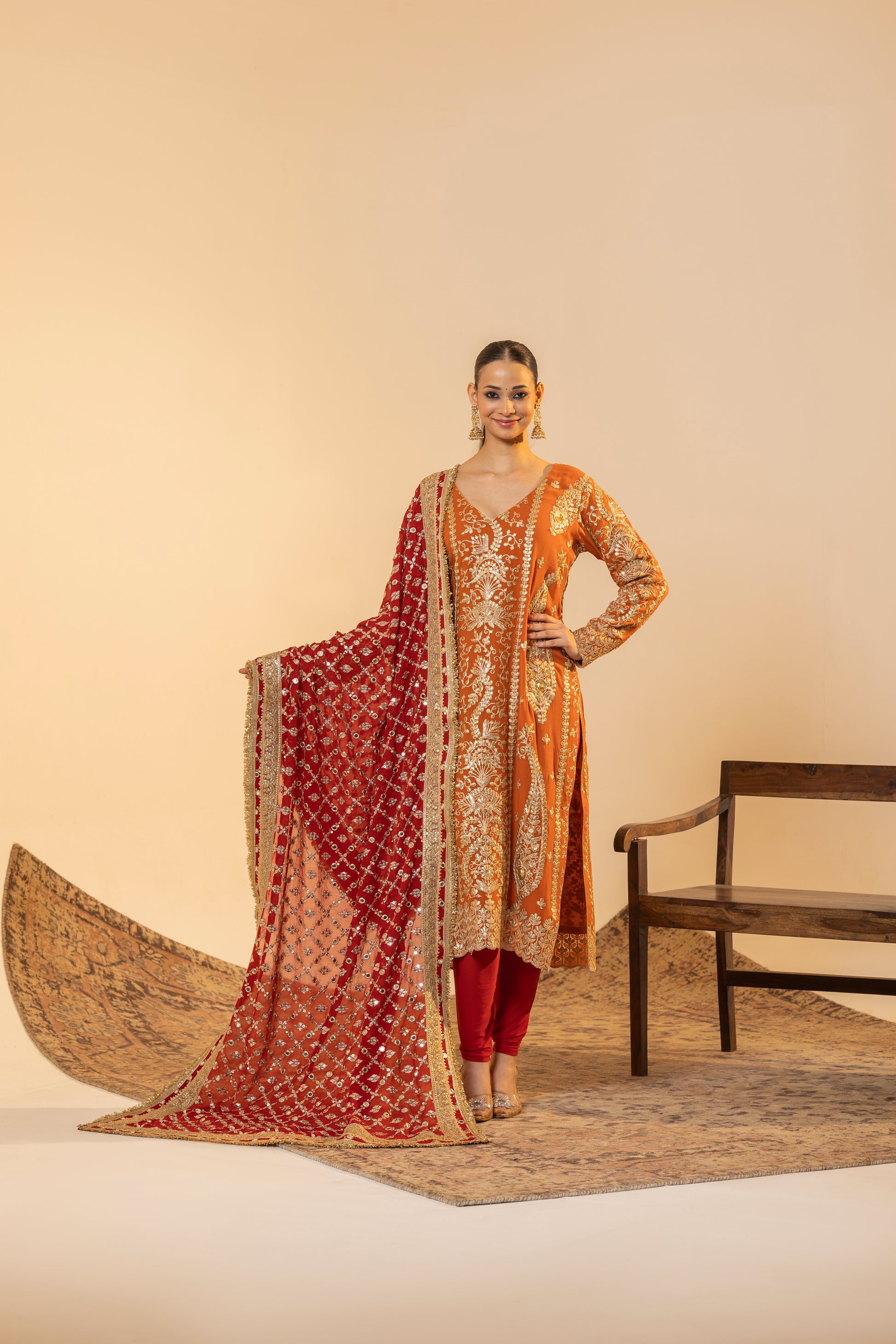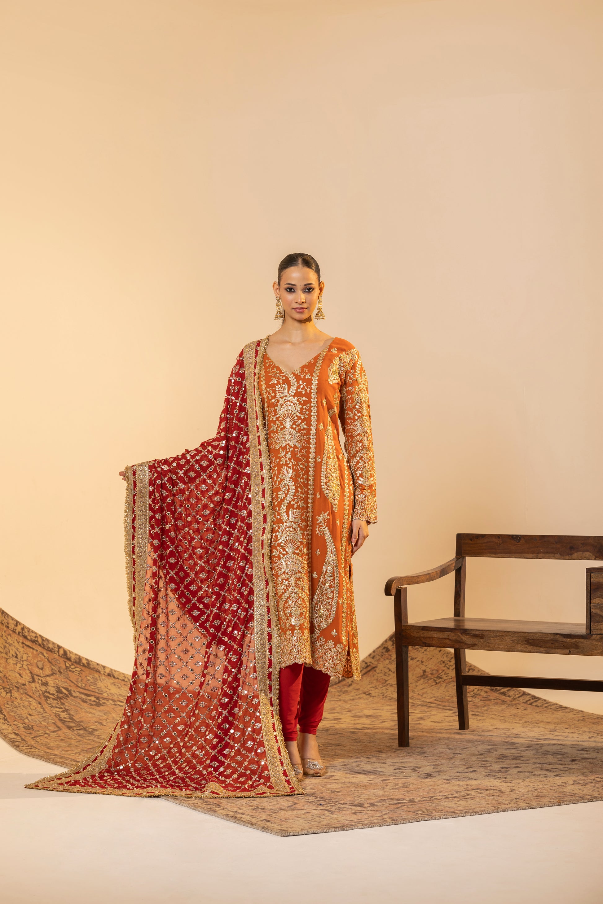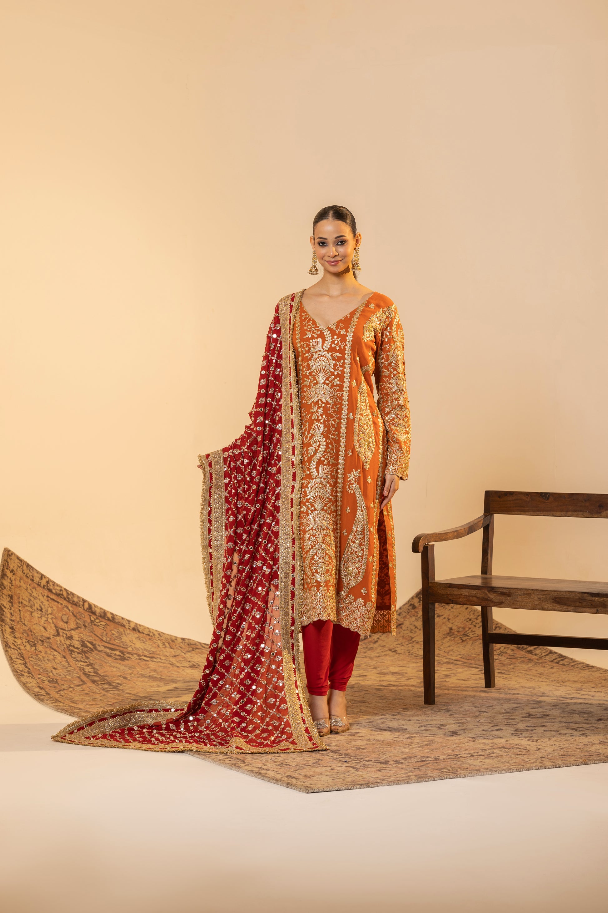 Auspicious Warmth and Rich Craftsmanship. This stunning Marigold Orange suit set captures the warmth of Indian festivities. The kurta is meticulously detailed with traditional Tilla embroidery, while the ensemble is uplifted by a heavily sequined Red Contrast Dupatta. This vibrant pairing of colours and textures makes it perfect for Karva Chauth, Diwali, or any grand Festive occasion.