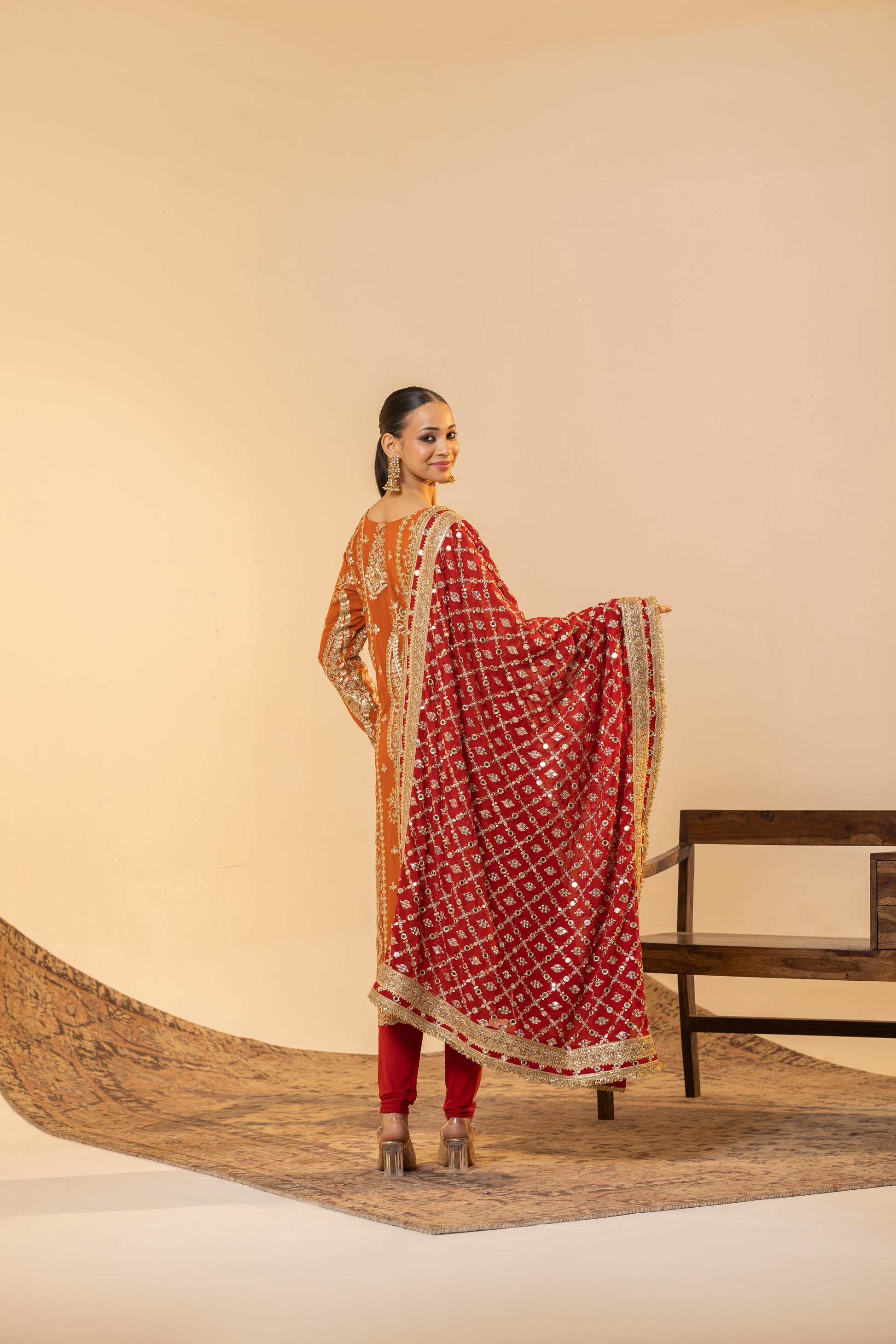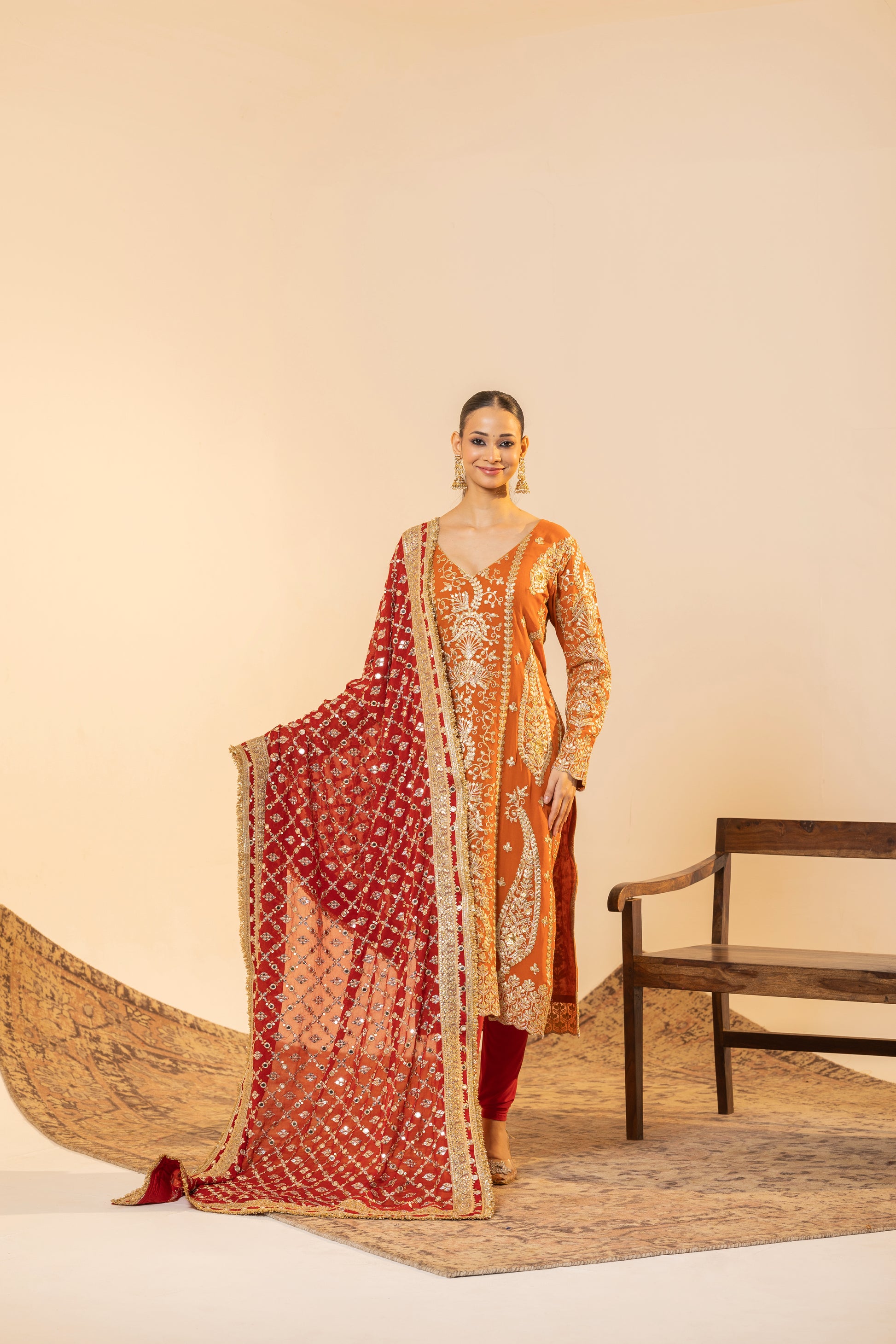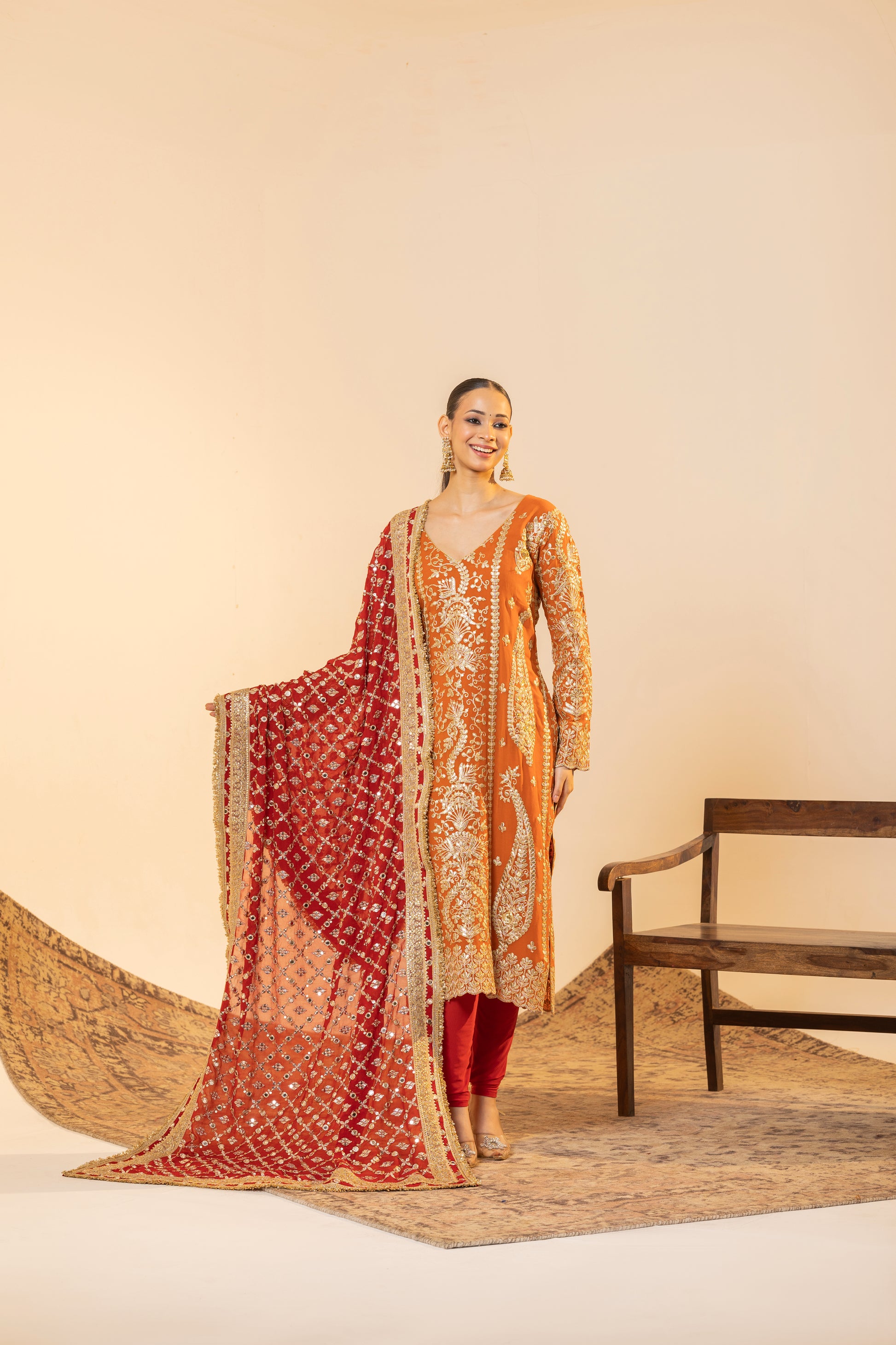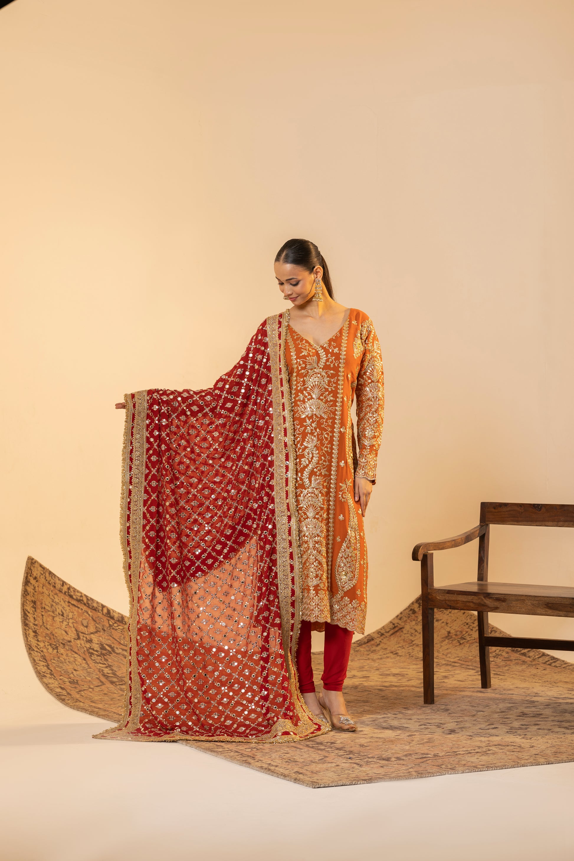 Auspicious Warmth and Rich Craftsmanship. This stunning Marigold Orange suit set captures the warmth of Indian festivities. The kurta is meticulously detailed with traditional Tilla embroidery, while the ensemble is uplifted by a heavily sequined Red Contrast Dupatta. This vibrant pairing of colours and textures makes it perfect for Karva Chauth, Diwali, or any grand Festive occasion.