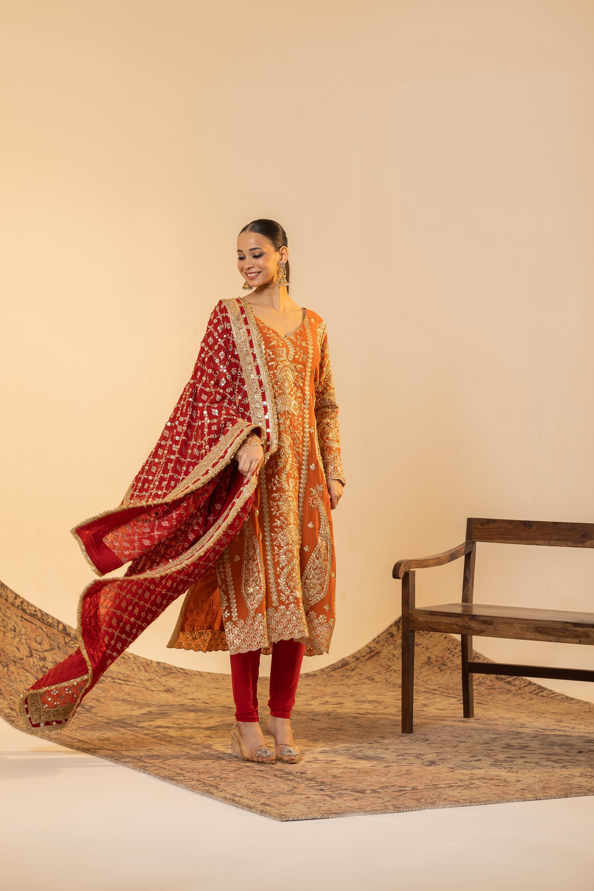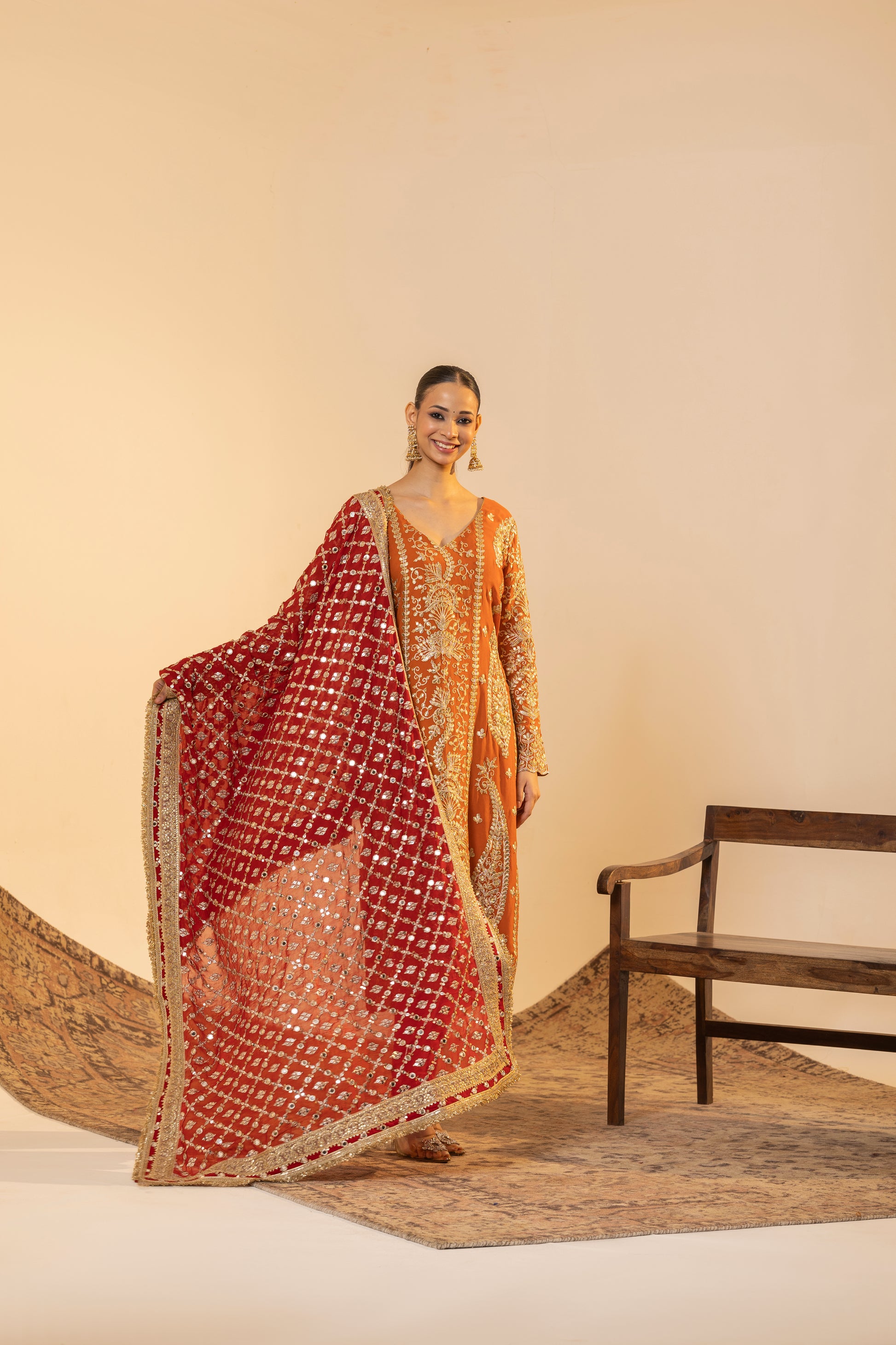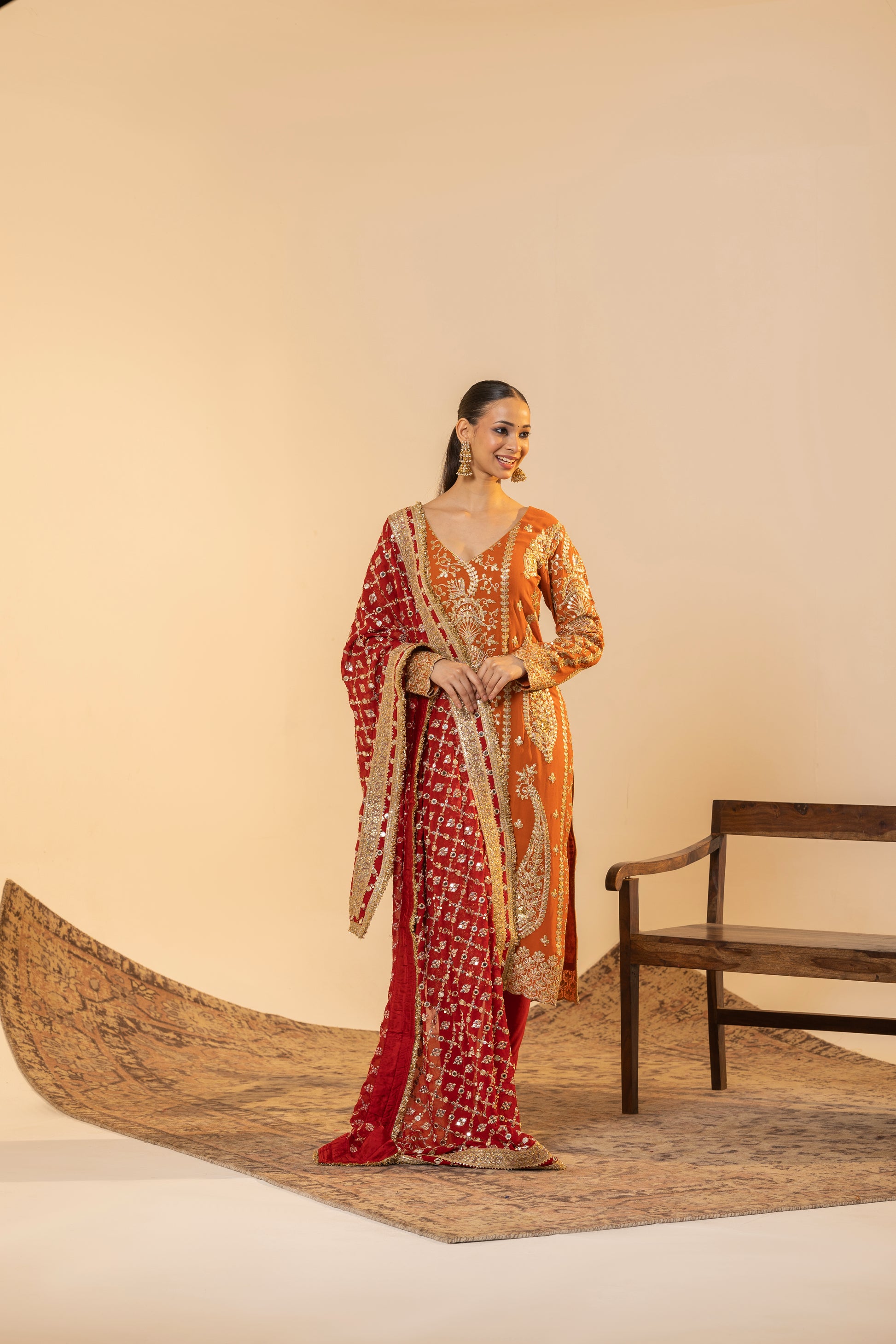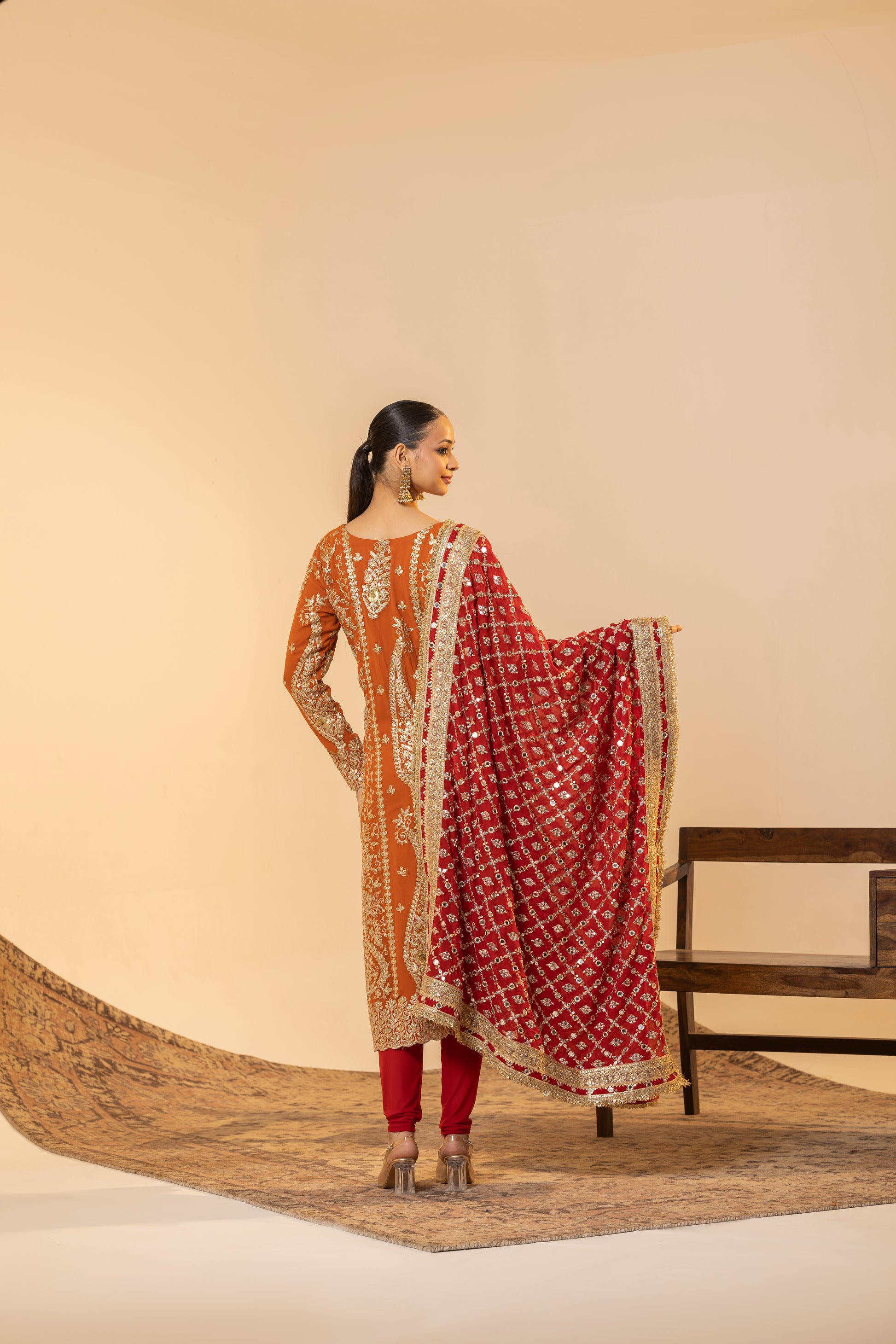 Auspicious Warmth and Rich Craftsmanship. This stunning Marigold Orange suit set captures the warmth of Indian festivities. The kurta is meticulously detailed with traditional Tilla embroidery, while the ensemble is uplifted by a heavily sequined Red Contrast Dupatta. This vibrant pairing of colours and textures makes it perfect for Karva Chauth, Diwali, or any grand Festive occasion.