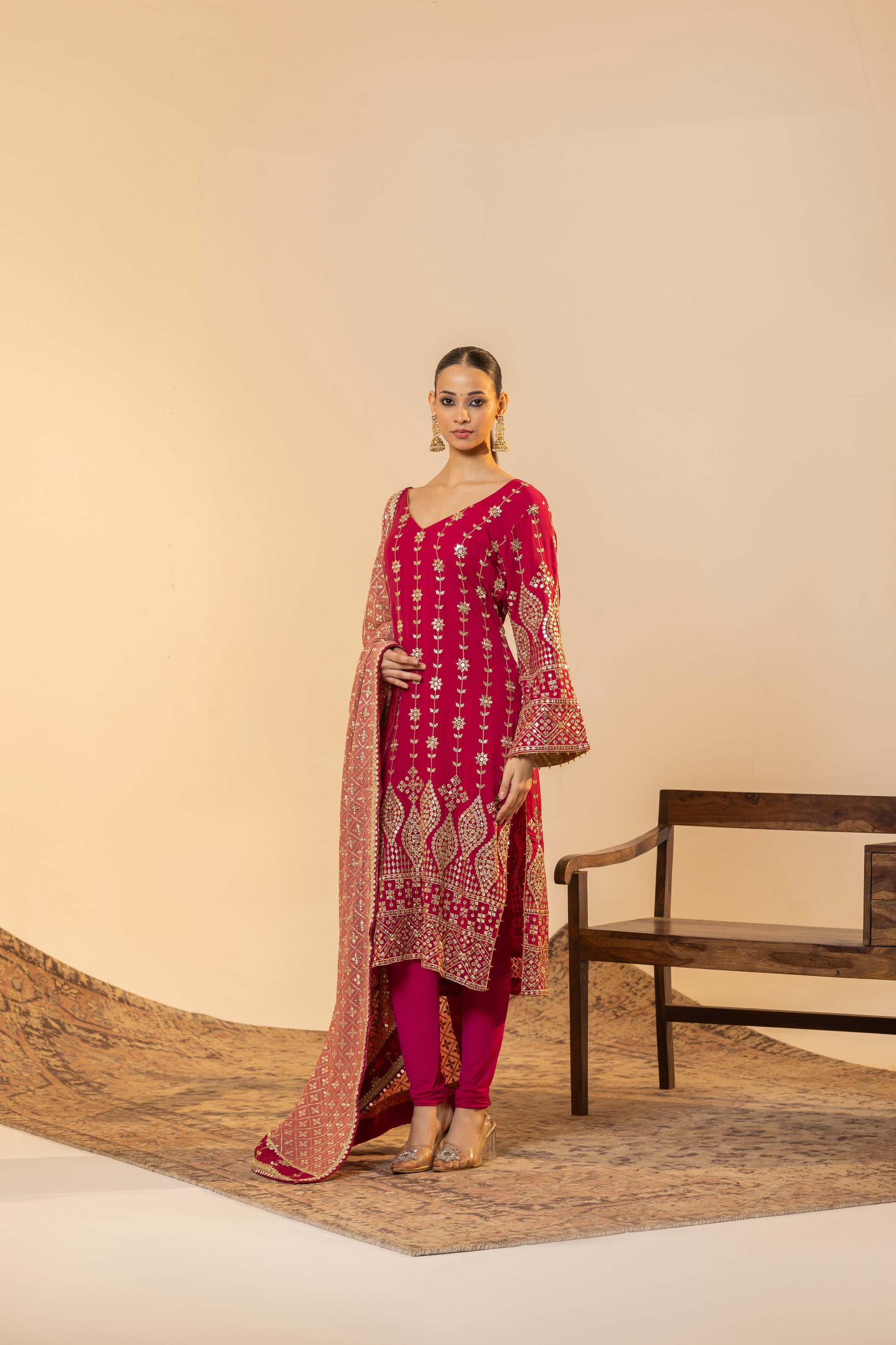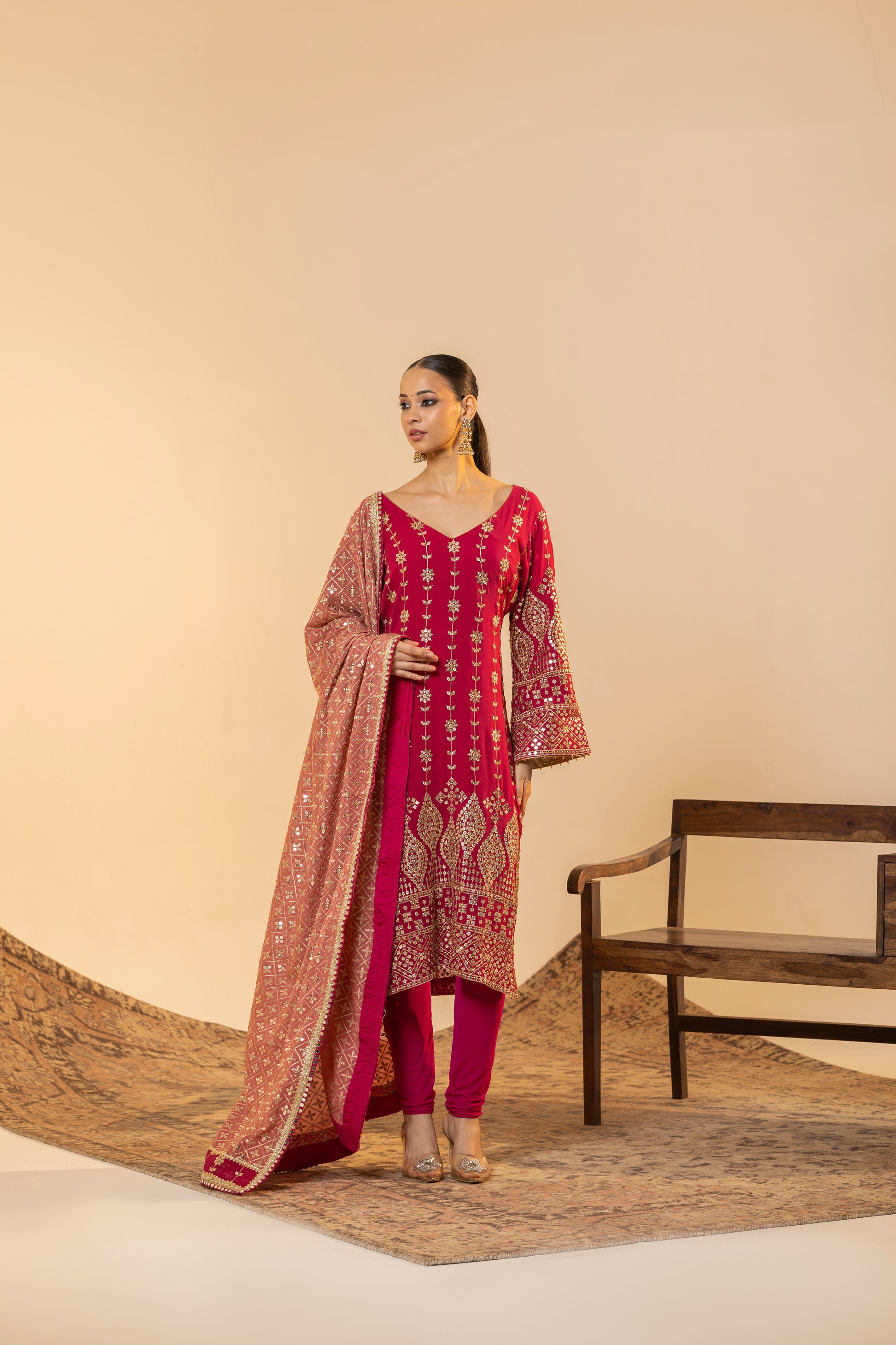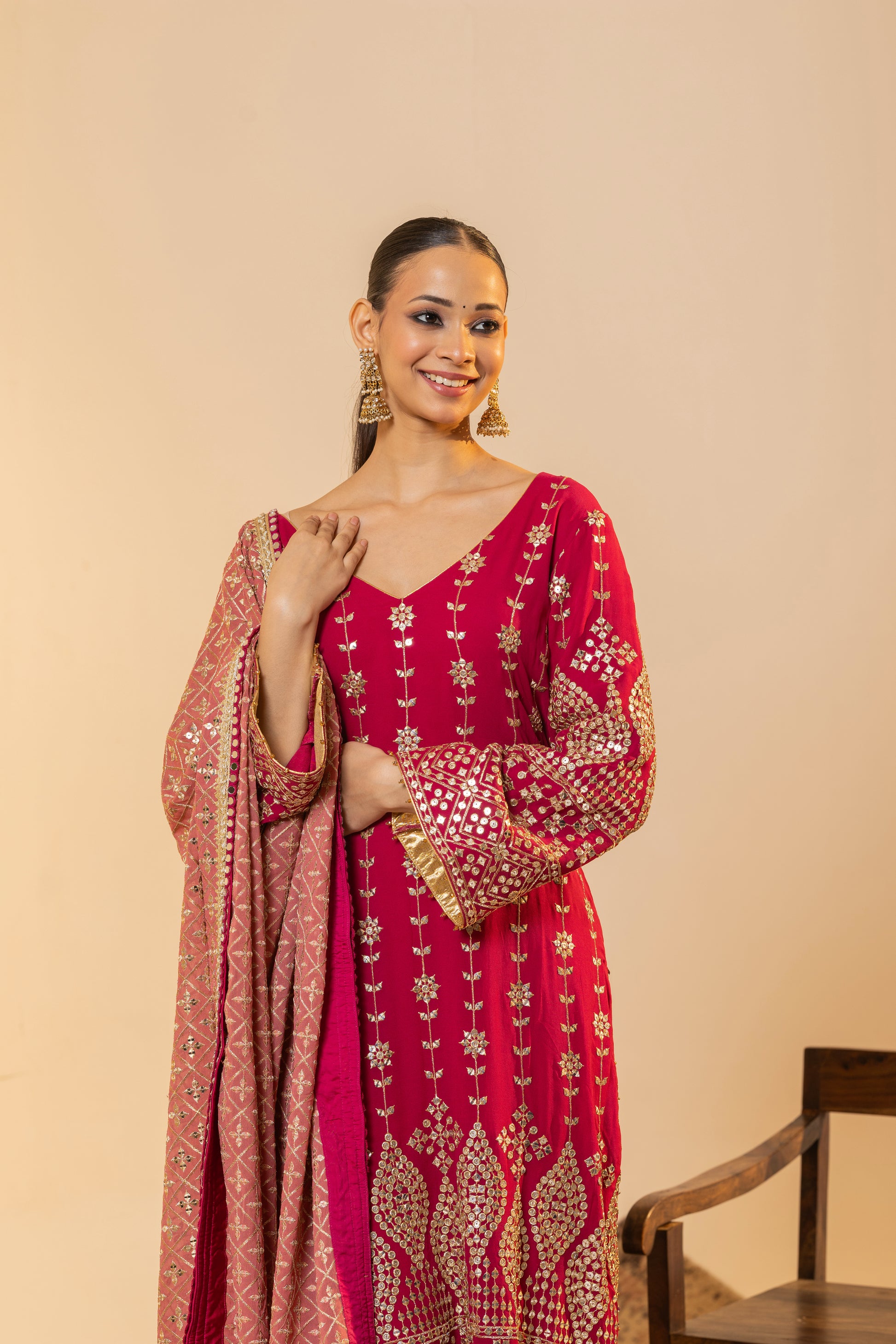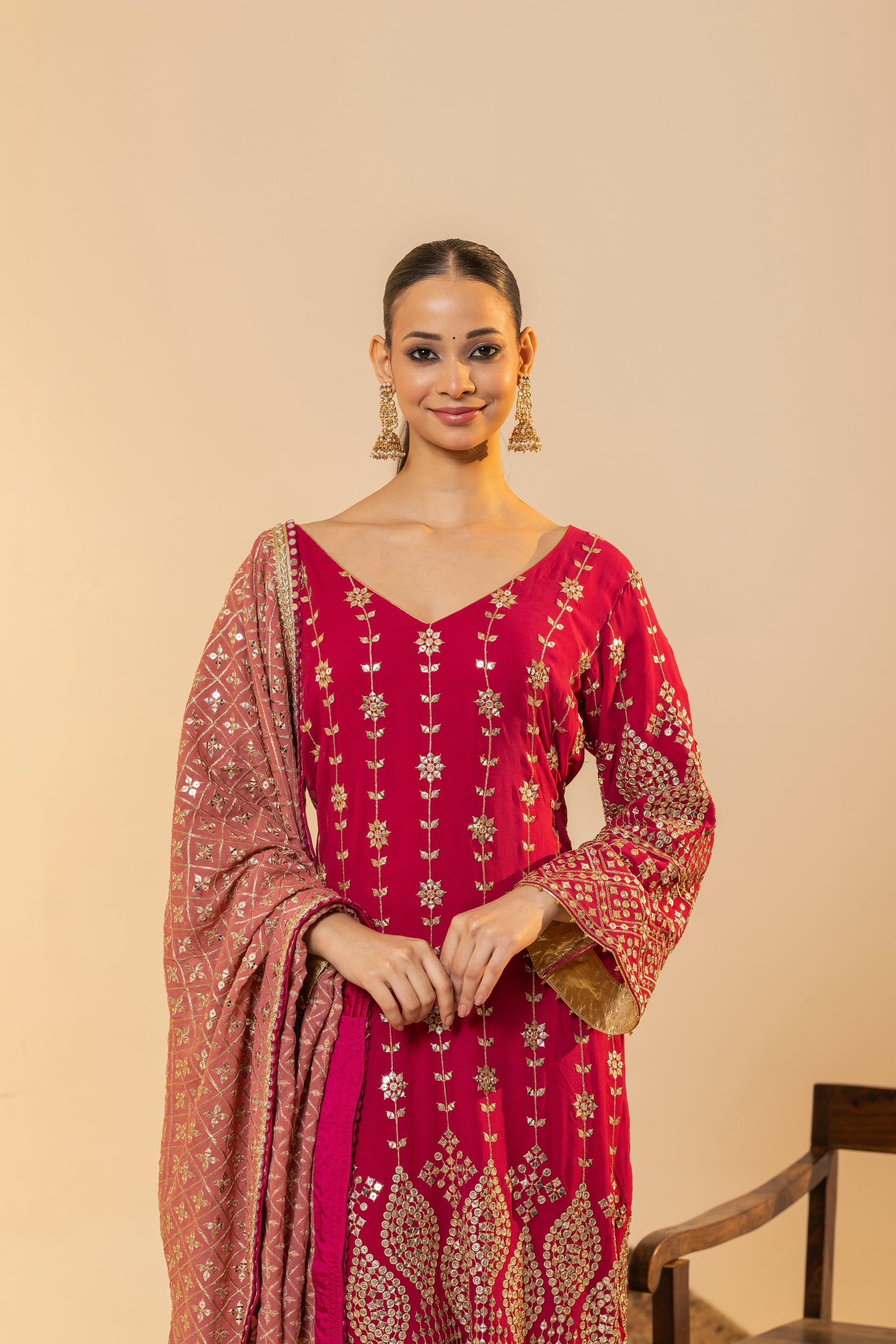 Vibrant Zest and Traditional Artistry. This traditional yet fashionable Rani Pink Suit Set features a straight-fit kurta adorned with dense gold Tilla and Zardozi embroidery. The striking flared or bell sleeves add a modern detail, while the luxurious fabric ensures a regal look. A quintessential outfit for Festive gatherings, family Pujas, or pre-wedding Celebrations.