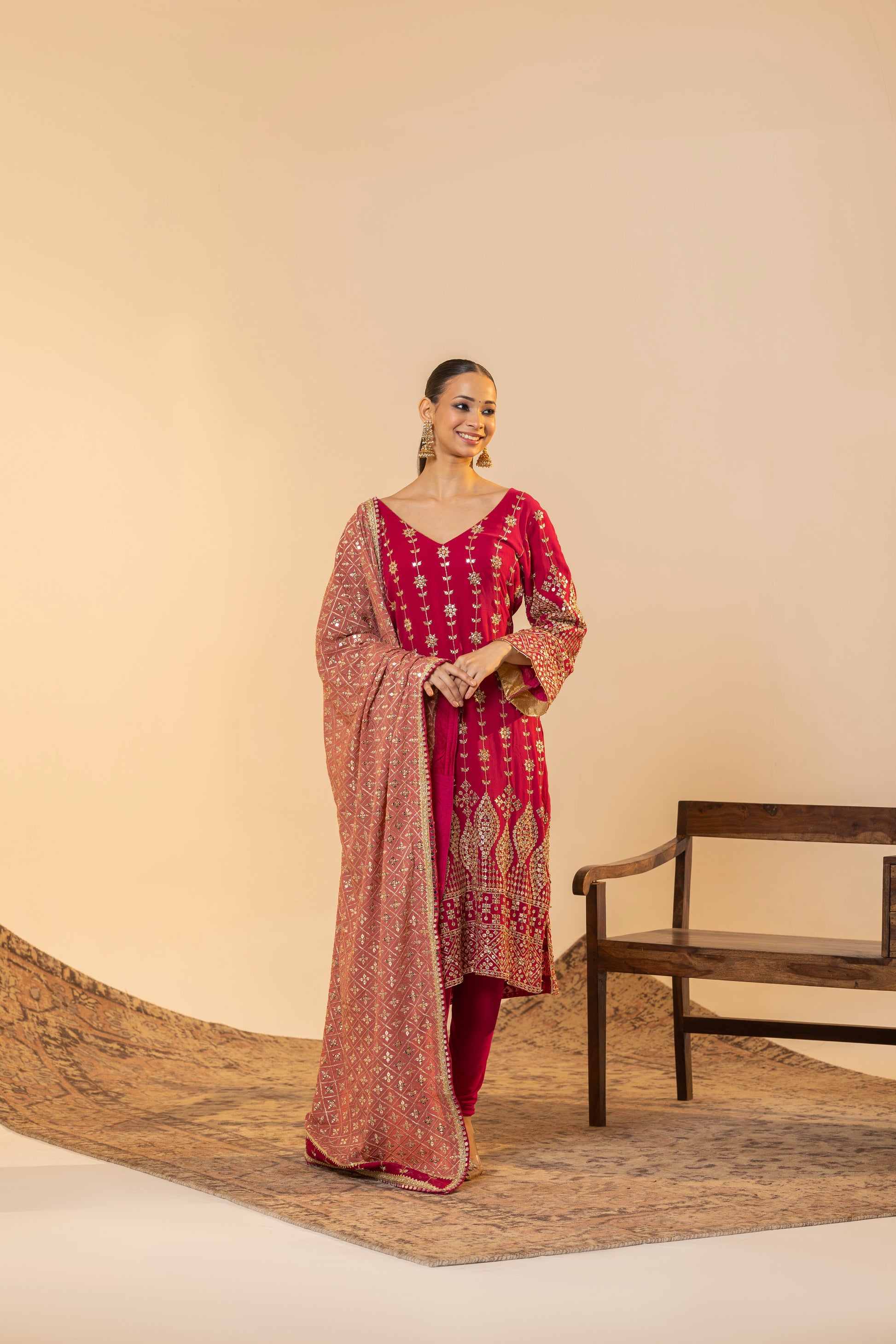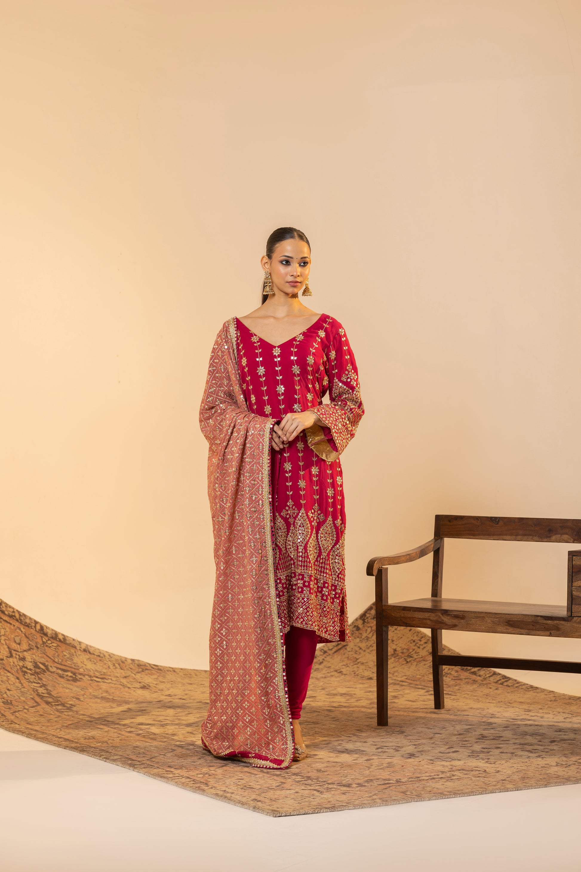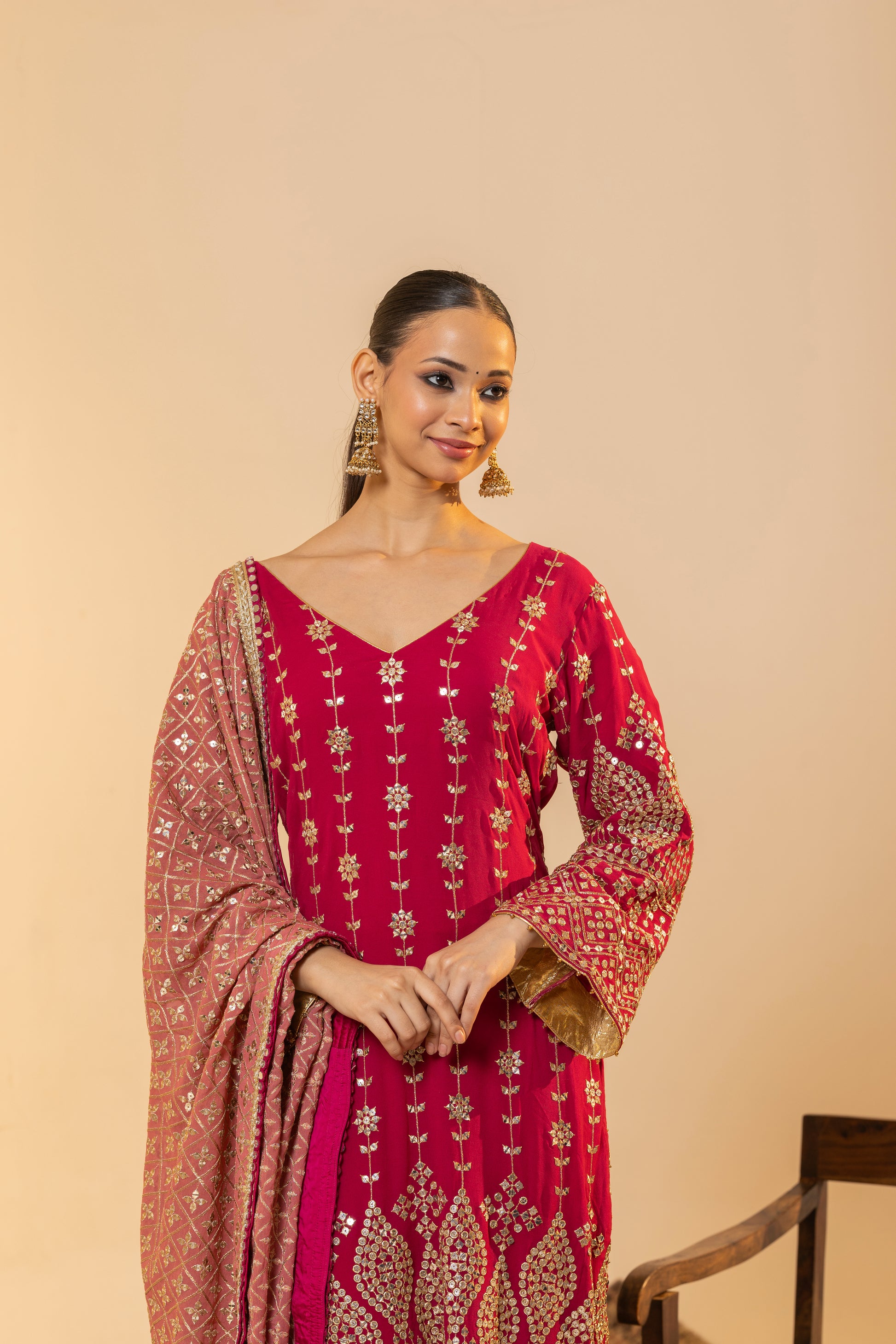 Vibrant Zest and Traditional Artistry. This traditional yet fashionable Rani Pink Suit Set features a straight-fit kurta adorned with dense gold Tilla and Zardozi embroidery. The striking flared or bell sleeves add a modern detail, while the luxurious fabric ensures a regal look. A quintessential outfit for Festive gatherings, family Pujas, or pre-wedding Celebrations.
