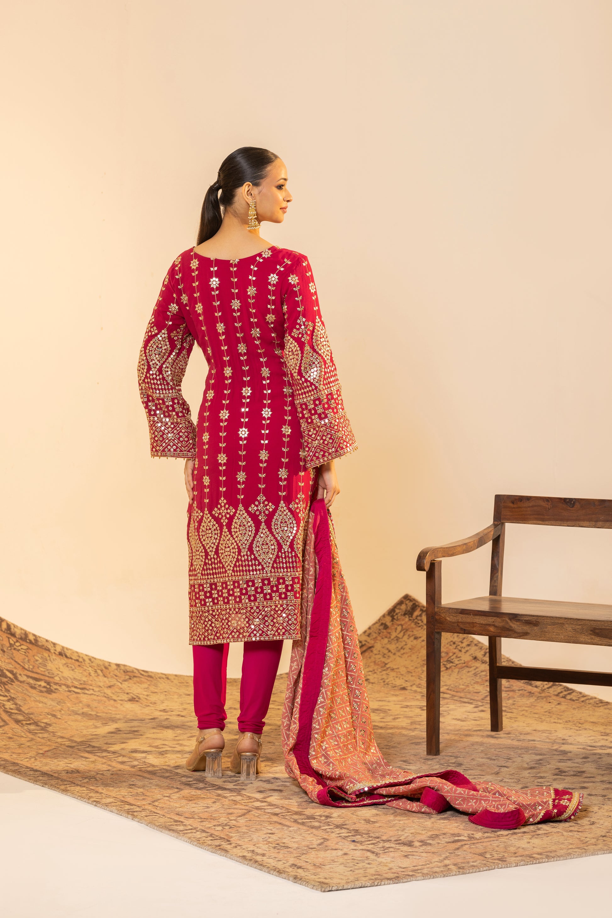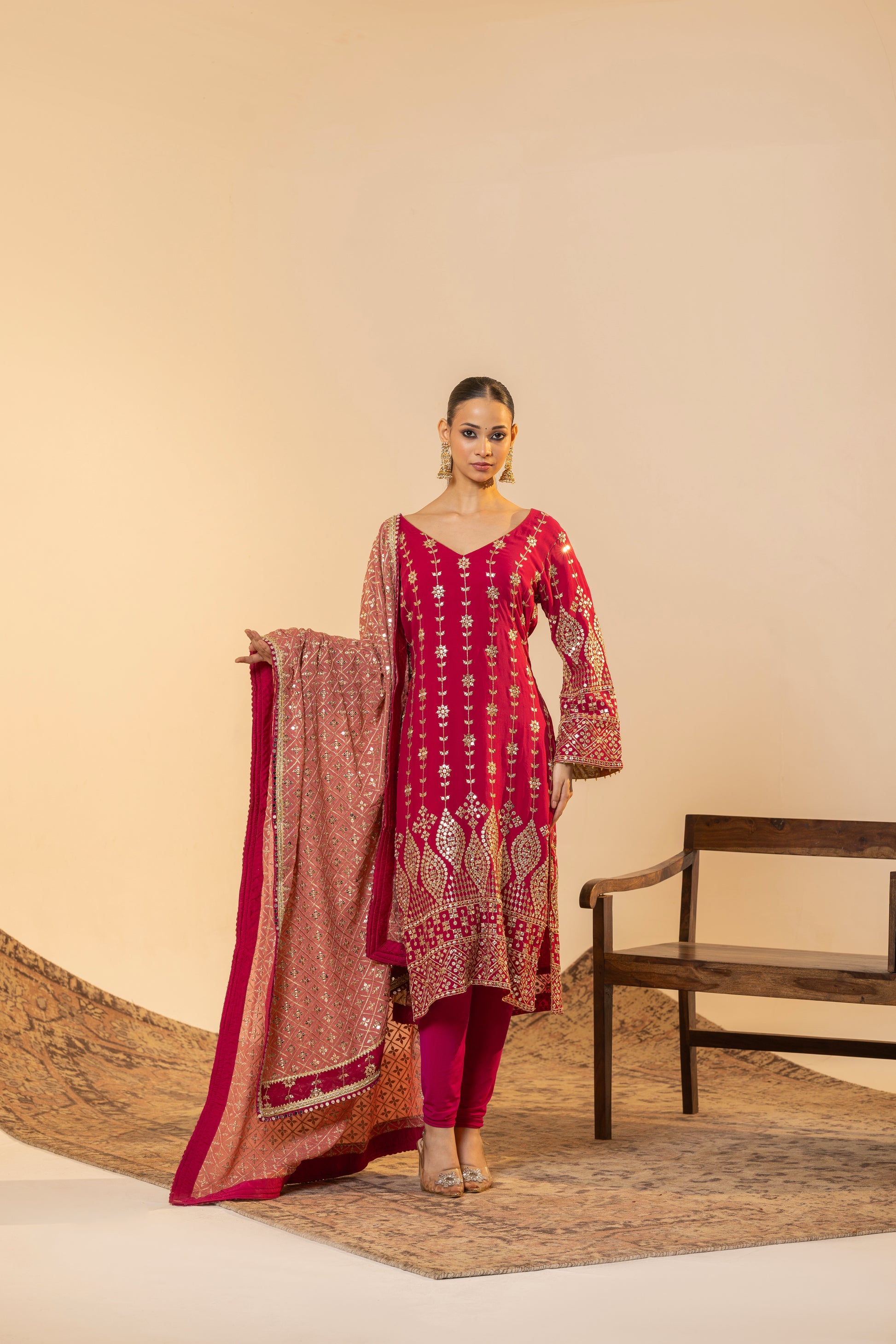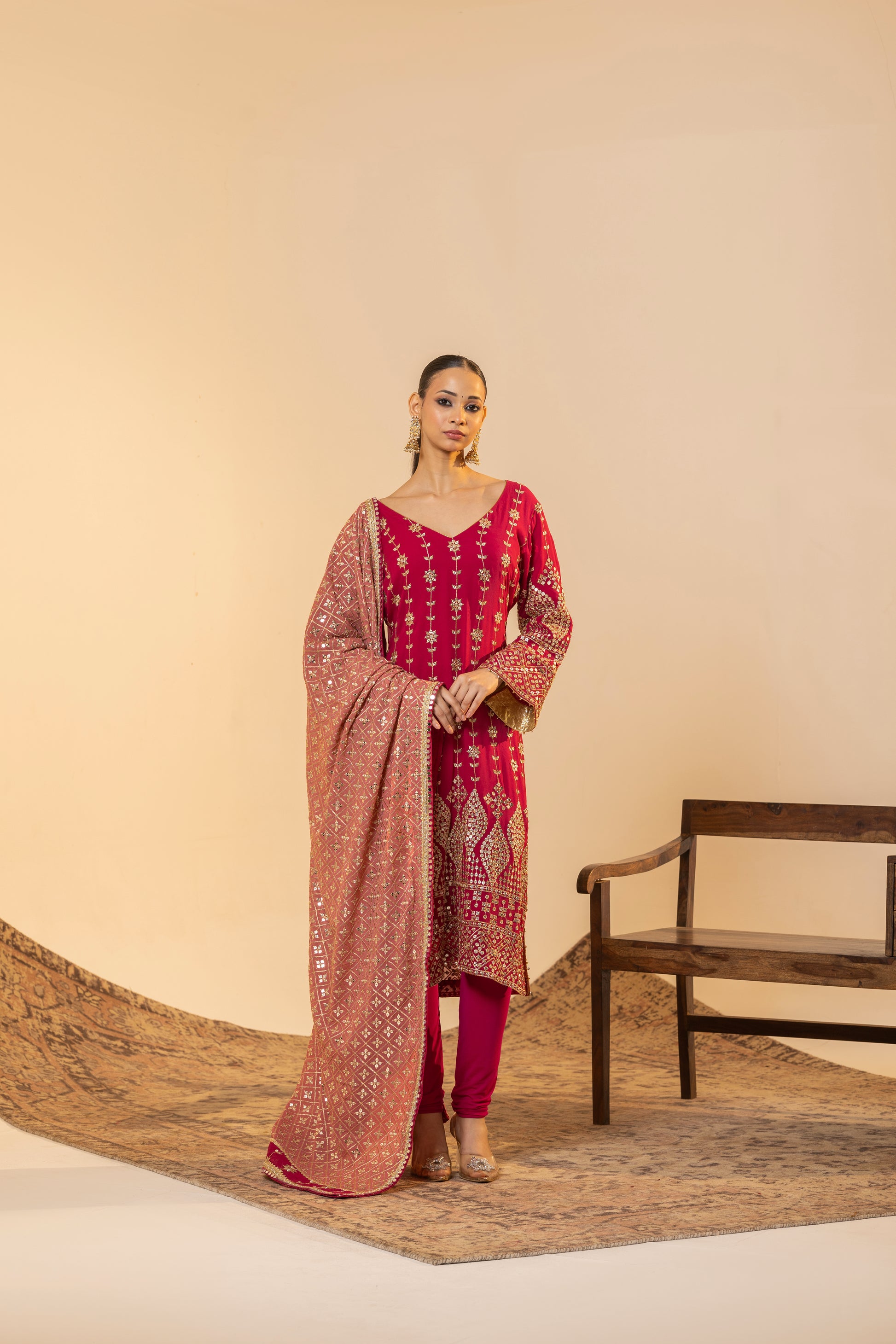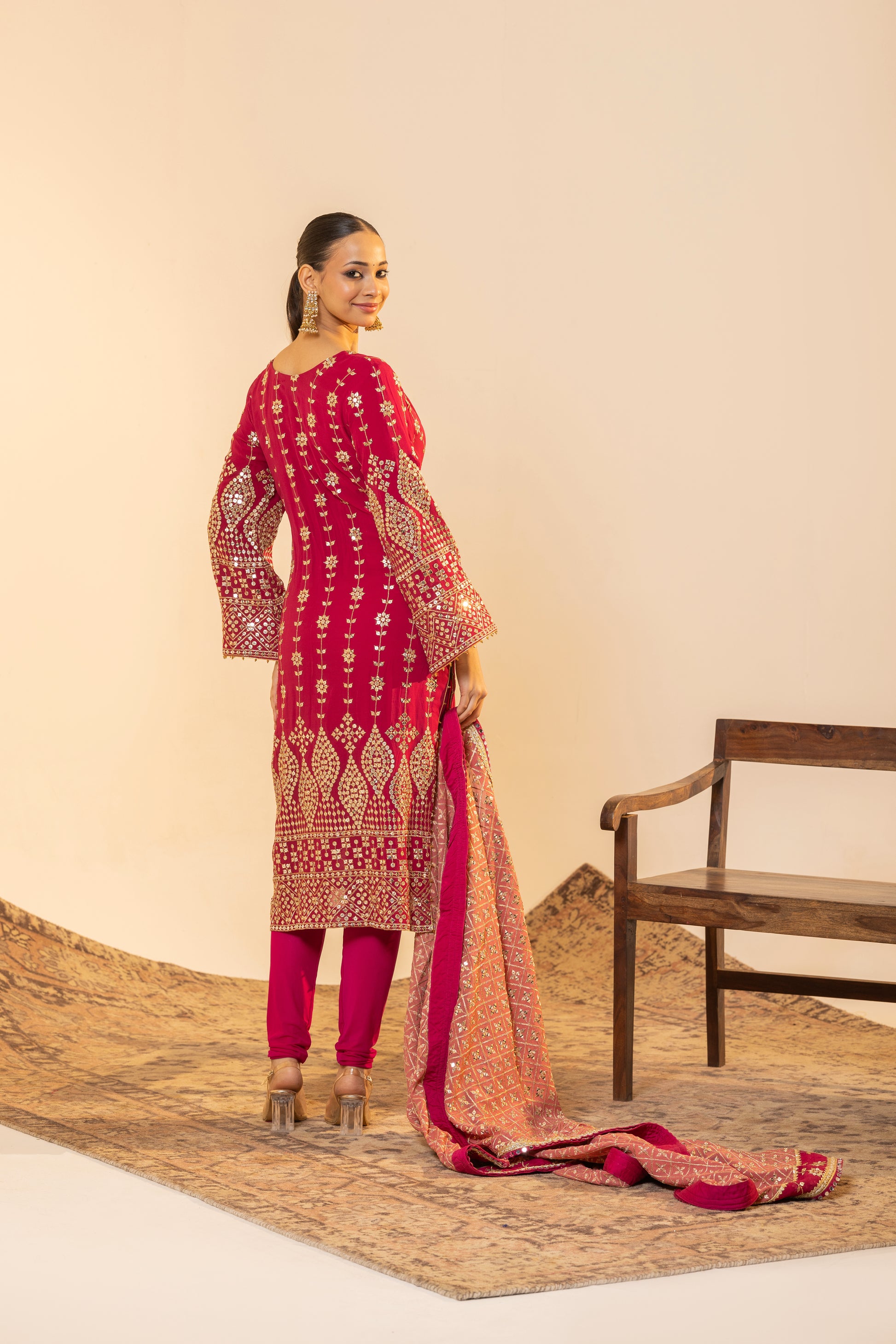 Vibrant Zest and Traditional Artistry. This traditional yet fashionable Rani Pink Suit Set features a straight-fit kurta adorned with dense gold Tilla and Zardozi embroidery. The striking flared or bell sleeves add a modern detail, while the luxurious fabric ensures a regal look. A quintessential outfit for Festive gatherings, family Pujas, or pre-wedding Celebrations.